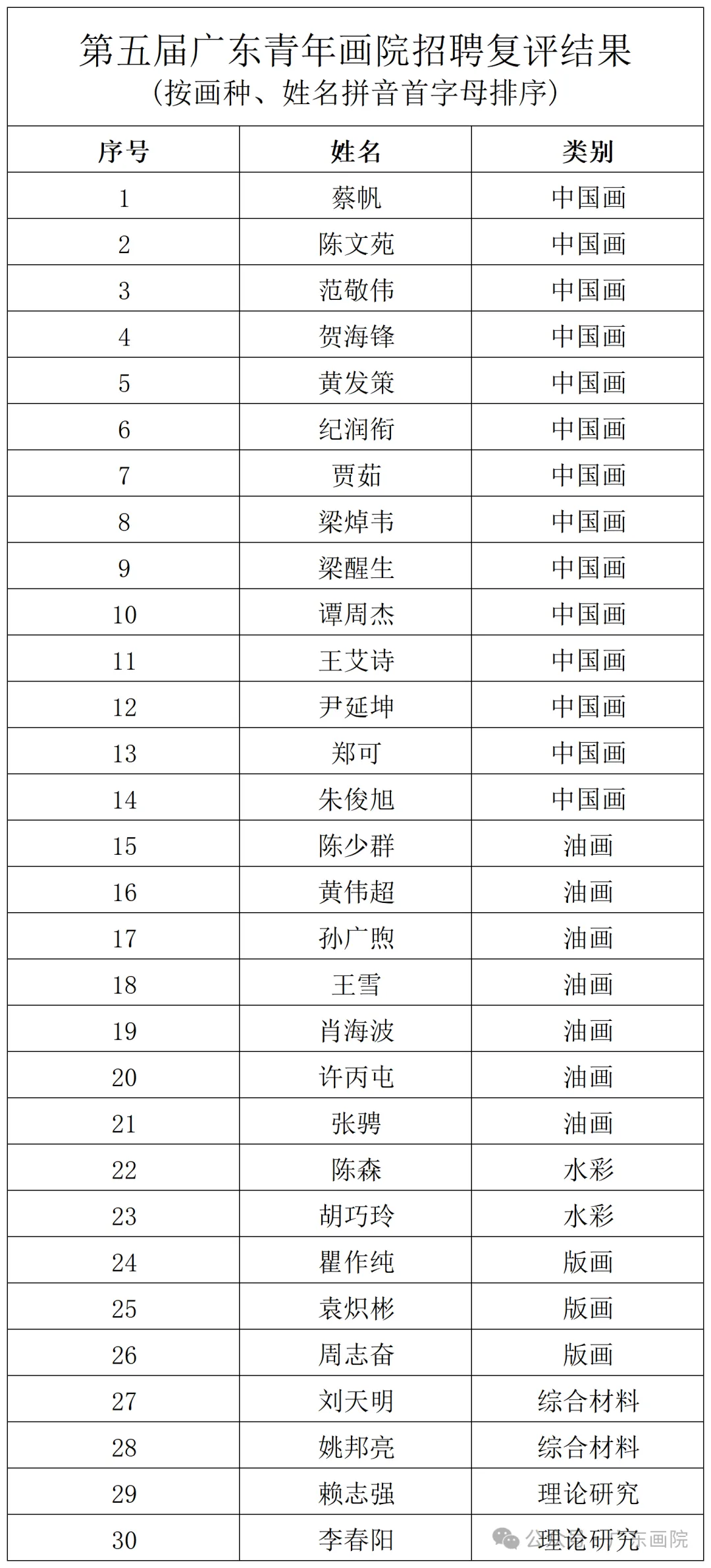 “十五五”规划开局之年,为夯实文化人才队伍根基、响应“百万英才汇南粤”人才战略,第五届广东青年画院选聘工作顺利开展。近日,广东画院专业评审委员会专家对初评入围的45名作者的作品及成果进行严格评审,最终确定30名入选作者,现将复评结果及第五届广东青年画院入选名单公布如下: