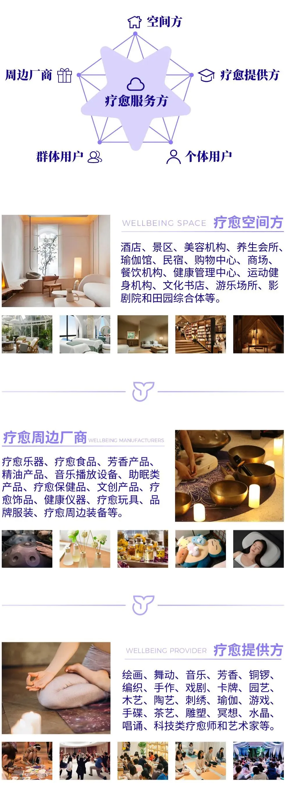 集结疗愈经济全景图中的疗愈空间方、疗愈周边厂商、疗愈提供方、疗愈服务方、个体用户和群体用户,为全产业链上下游搭建零距离对接与合作的机会。