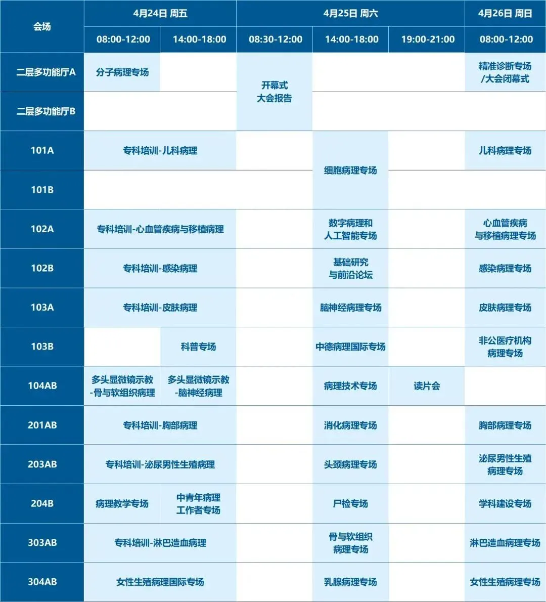 上午:全体大会 / 开幕式、专科病理诊断培训、分子病理专场、多头读片讨论会、女性生殖病理国际专场、病理教学培训 下午:专科病理诊断培训、科普分会场、多头读片讨论会、女性生殖病理国际专场、中青年病理工作者专场、数字病理与人工智能专场