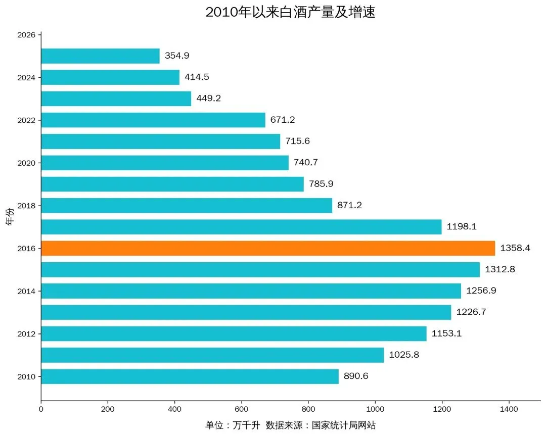 翻开国家统计局的数据,中国白酒行业正经历一场深刻的“量减时代”。2016年,全国白酒产量达到1358.4万千升的峰值,而到2025年,这一数字已暴跌至354.9万千升,9年间降幅超74%。这不是简单的行业周期性调整,而是政策、市场、消费三重力量共同作用下,白酒行业从规模扩张到高质量发展的结构性重构。