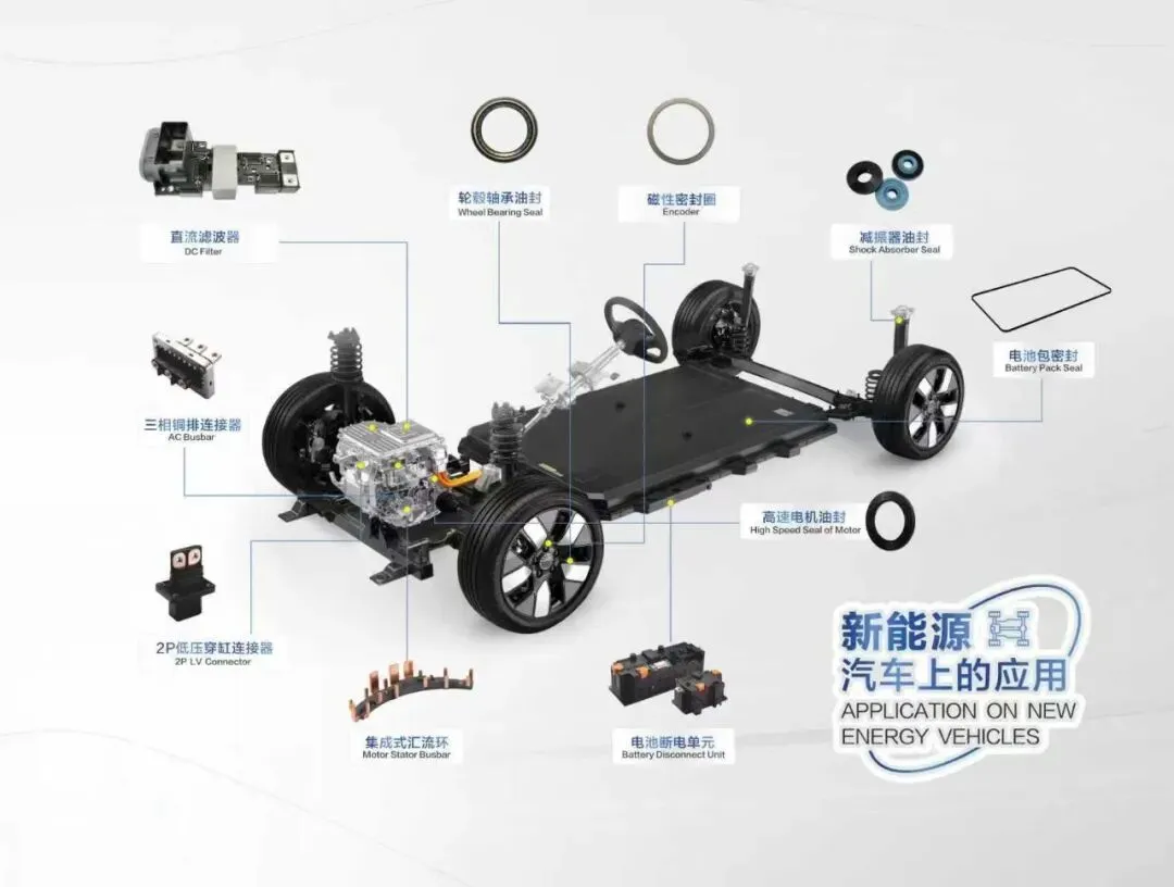 昌誉科技从2018年开始进军新能源业务市场,目前已成功向市场推出了包含电机油封、电池包密封、高压铜排连接器、对插连接器、直流(滤波)连接器、电池断电单元等在内的多种新能源应用产品。