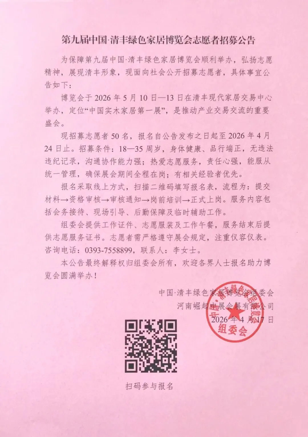 为保障第九届中国·清丰绿色家居博览会顺利举办,弘扬志愿精神,展现清丰形象,现面向社会公开招募志愿者。