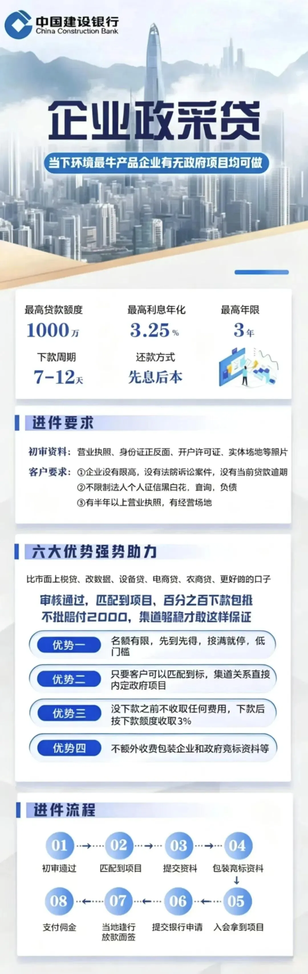 好消息来袭,近日,中国建设银行在“助民企‘建’行动 向未来”支持民营经济高质量发展推进会上表示,到2027年末力争为各类民营经济主体提供融资规模不少于8万亿元。建设银行中标贷是当下环境最牛的贷款产品,企业有无中标均可做。而许多企业常面临"先垫资后回款"的困境:项目启动需垫付30%-50%资金,而工程款结算周期长达3-6个月。建设银行凭借国有大行优势,创新推出"企业中标贷"产品,精准破解这一困局——以中标通知书为融资凭证,最高可贷合同金额80%,真正实现"中标即获资",企业中标贷比市面上税贷、设备贷、电商贷、农商贷更好做,审核通过,匹配到标,百分百下款。