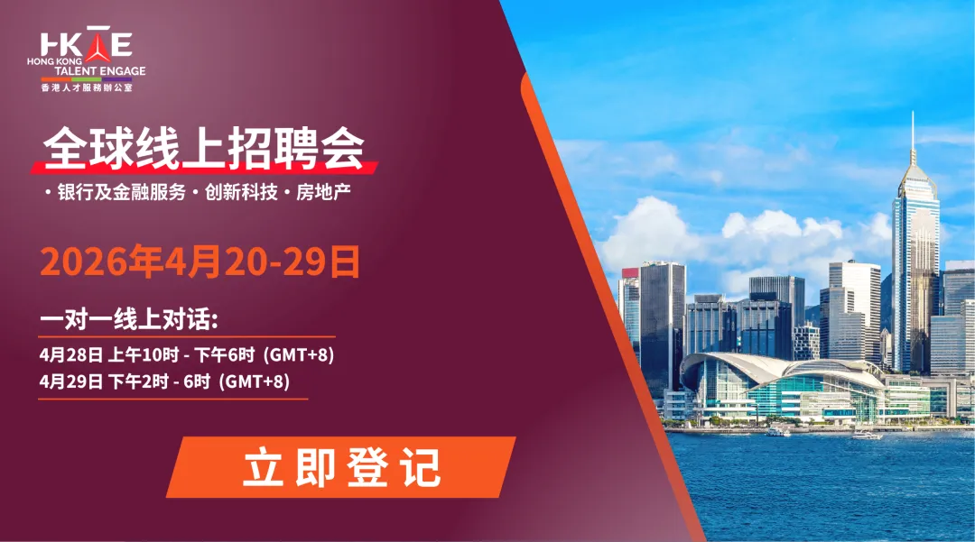 「全球网上职业博览会」今日正式展开!无论你身在何处,立即登记及探索香港银行与金融服务、创新科技、房地产及物业等领域的工作机会。你亦可透过平台,预约与蚂蚁集团、香港康得思酒店、恒生银行有限公司及香港赛马会等香港领先企业进行一对一即时对话。透过先进人工智能,进行即时面试情境练习,并获取个人化履历评核。与雇主直接互动,进行即场面试、建立人脉网络及获取即时意见回馈。?2026年4月28日|上午10:00 – 下午6:00 (GMT+8)?2026年4月29日|下午2:00 – 下午6:00 (GMT+8)?2026年4月28日|下午1:15 – 1:45 (GMT+8)讲者:陈展弘先生 - Expivotal Consultancy 组织心理学家及企业顾问?2026年4月28日|下午2:30 – 3:00 (GMT+8)讲者:梁咏迦女士 - The Talent Hub 管理合伙人?2026年4月29日|下午2:30 – 3:00 (GMT+8)讲者:罗雪欣女士 - Wow Impact Group 创始人?2026年4月29日|下午3:30 – 4:00 (GMT+8)《探索香港就业市场:环球人才的策略、技能与成功之道》讲者:谭文生先生 - Relearn Education Limited 首席顾问准备好在这“亚洲国际都会”探索你的未来吗?密切关注人才办的最新信息与机遇:
