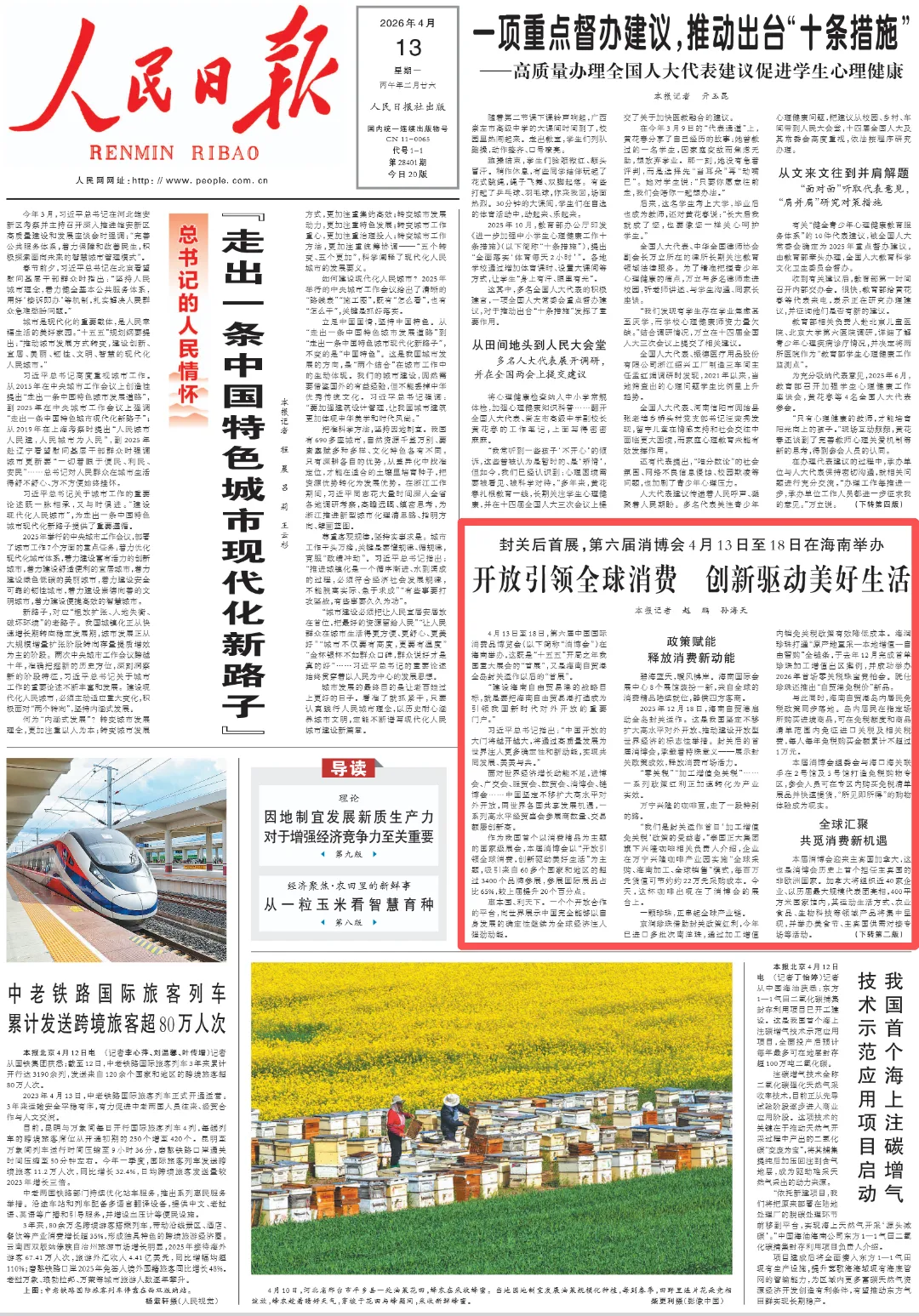 4月13日,《人民日报》头版刊发文章《封关后首展,第六届消博会4月13日至18日在海南举办 开放引领全球消费 创新驱动美好生活 》,版面图及全文如下: