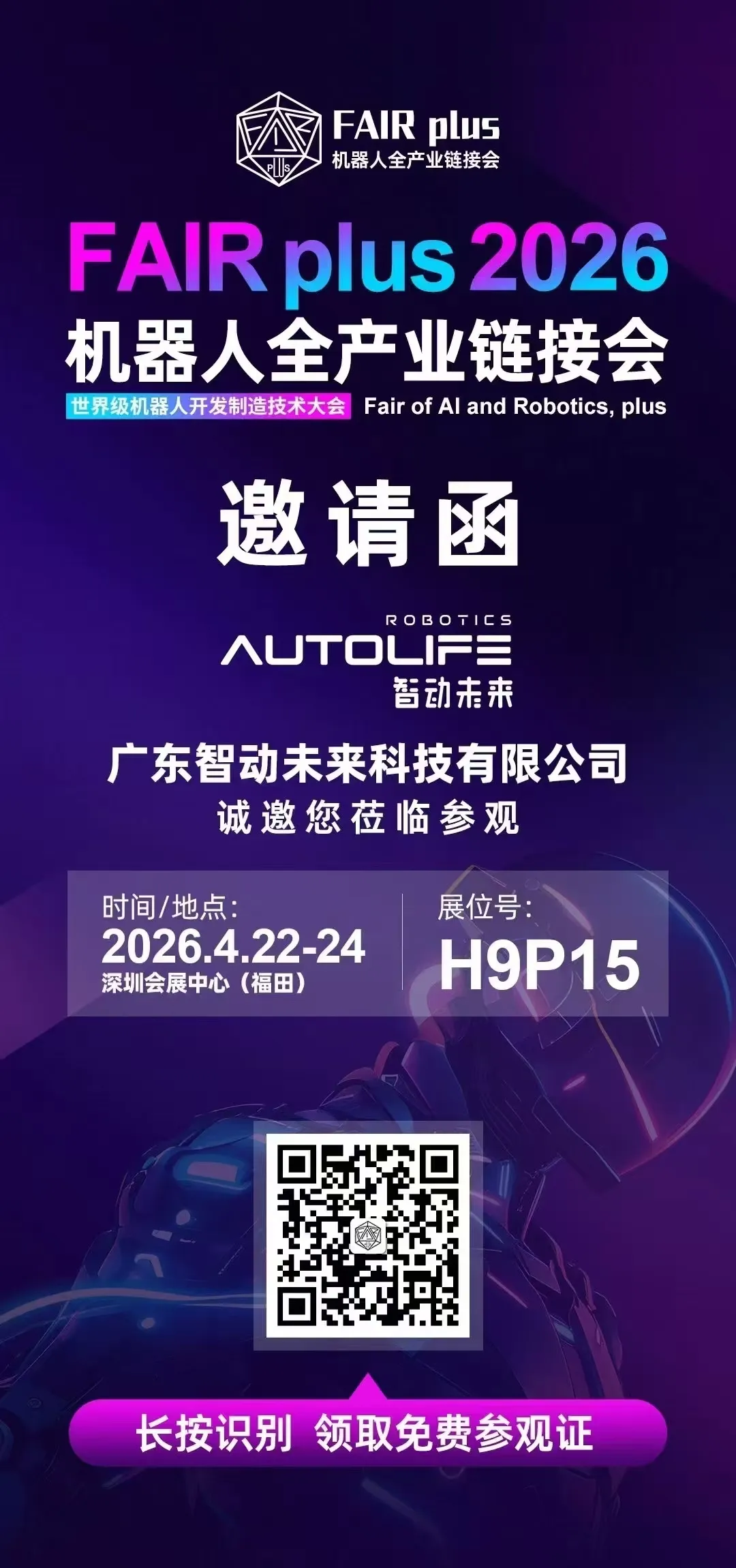 2026 年 4 月 22 日 - 24 日,世界级机器人开发制造技术大会 ——FAIR plus 2026 机器人全产业链接会将于深圳会展中心(福田)盛大举办。广东智动未来科技有限公司(AUTOLIFE ROBOTICS)受邀重磅参展,同时深度参与两大行业顶级论坛,全面展示公司前沿机器人技术研发成果与商业化落地实践,与全球行业同仁共话产业发展新趋势。