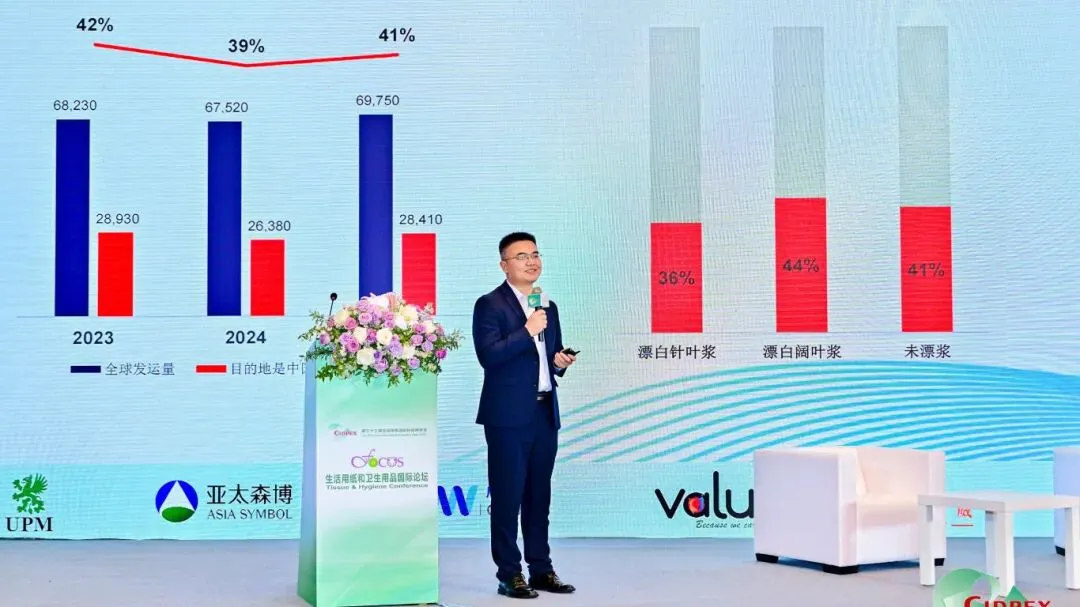 4月14日,生活用纸会场上,亚太森博战略市场部市场信息经理王洪鑫作《中国阔叶浆市场展望》主题分享,他在分享中指出,中国已成为全球阔叶浆需求的核心引擎。目前中国阔叶浆产量和进口量均大幅增长,高需求对国内外供应商形成有力支撑。预计2026年中国阔叶浆需求将继续扩大,未来十年中国将是全球纸板和阔叶浆需求增长最快的地区,其中生活用纸的增量最为突出。