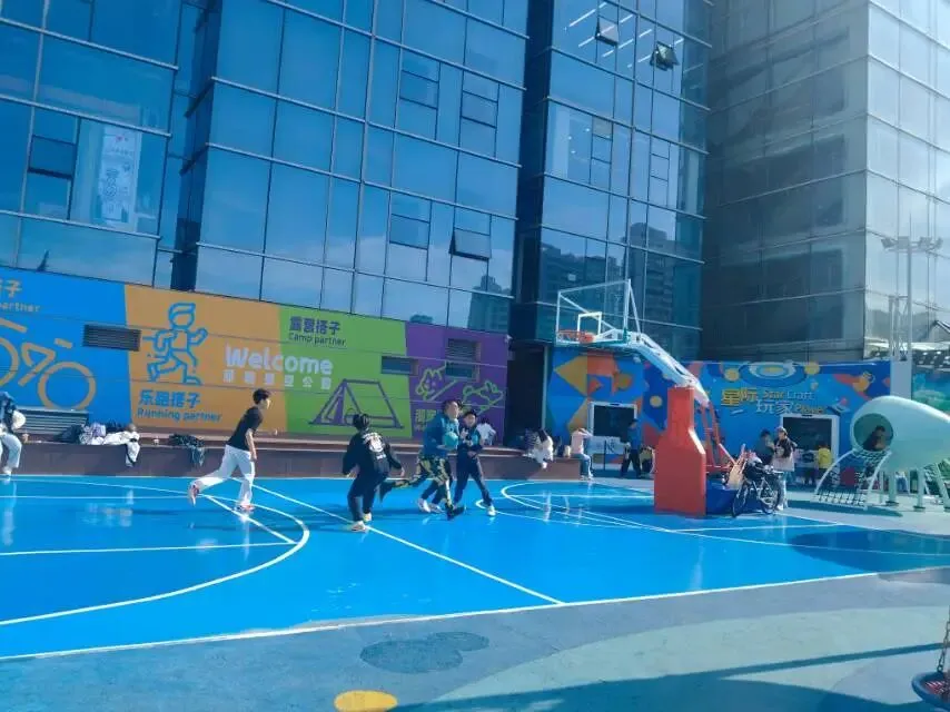 除了滑梯,乐园里还有无动力攀爬墙、乐游跑道、秋千、吊床,甚至能看到孩子带着平衡车、自行车来撒欢,跑跑跳跳间就能消耗大量体力,回家倒头就睡,老母亲终于能偷个懒。爱打篮球的还可以在这儿打个篮球。