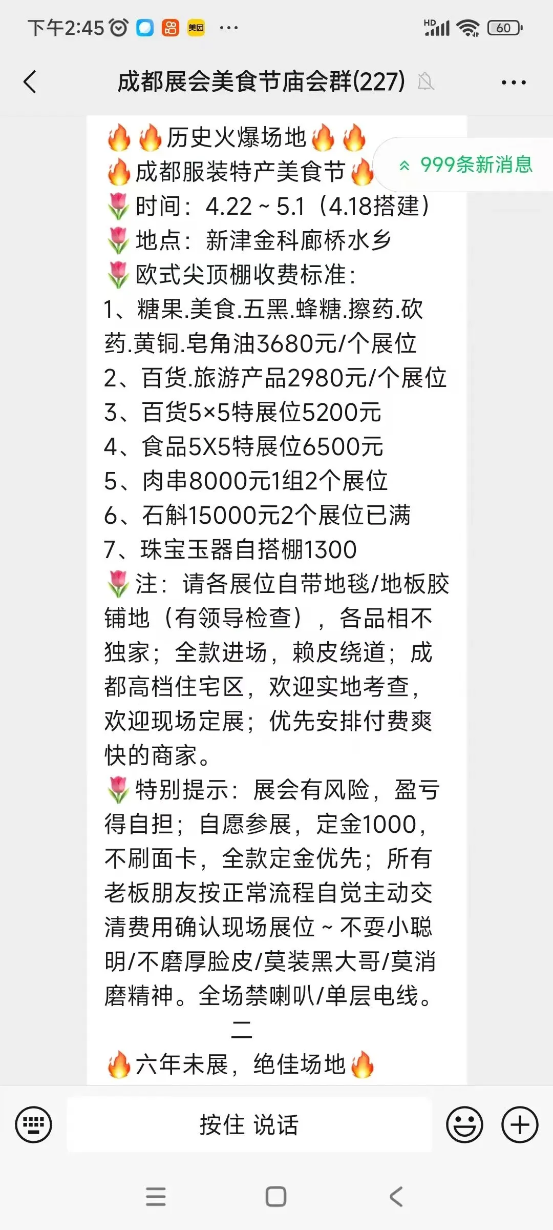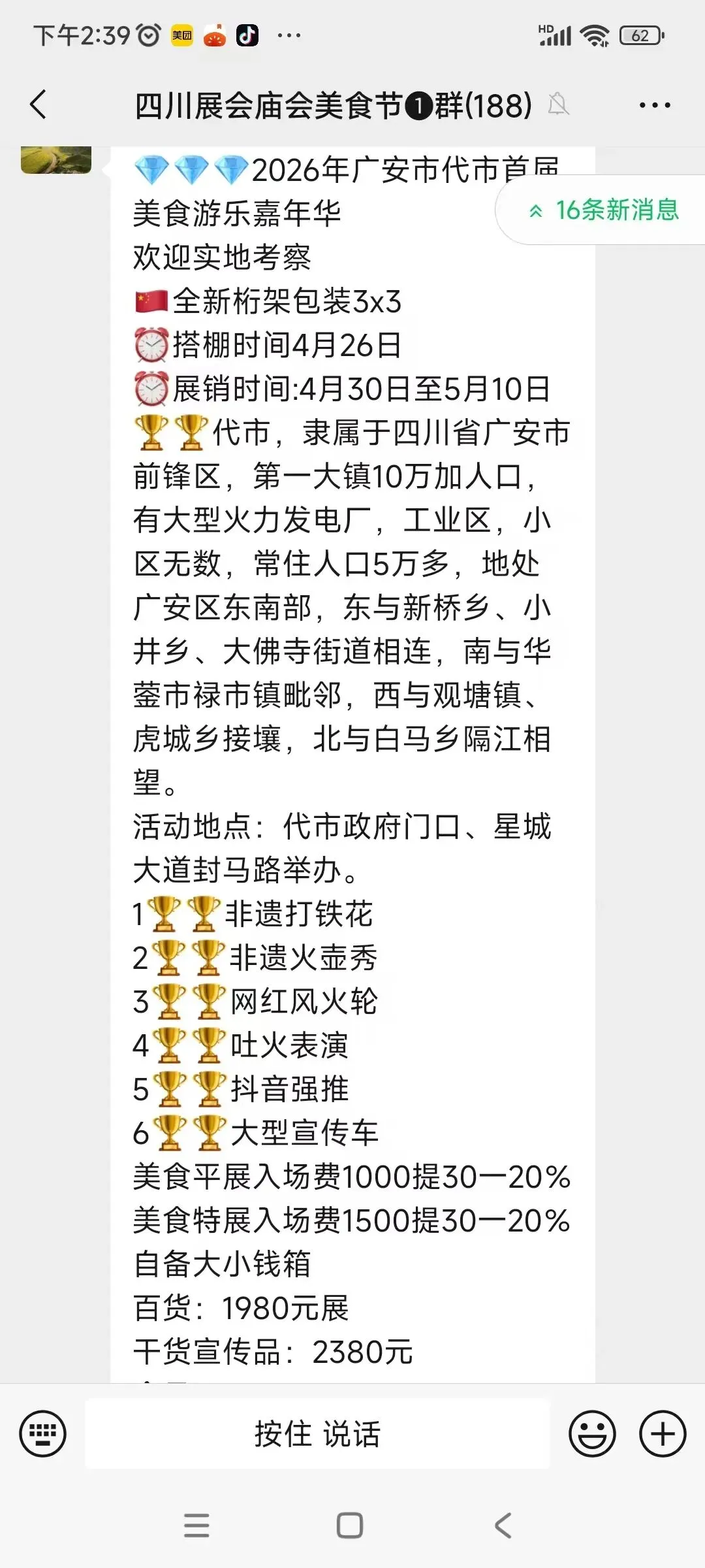 美食展位: 500场费,提成15一10,电费自理