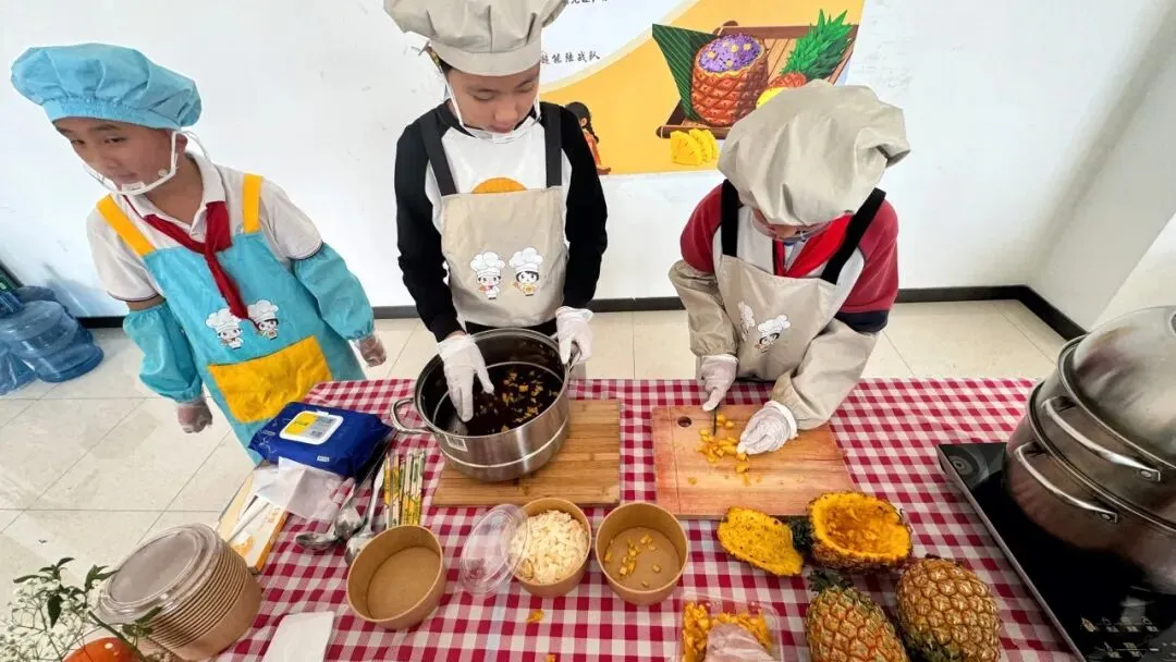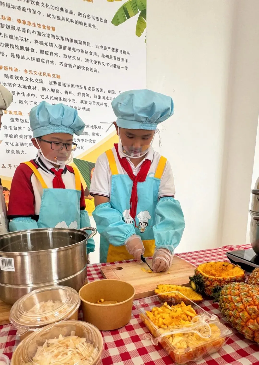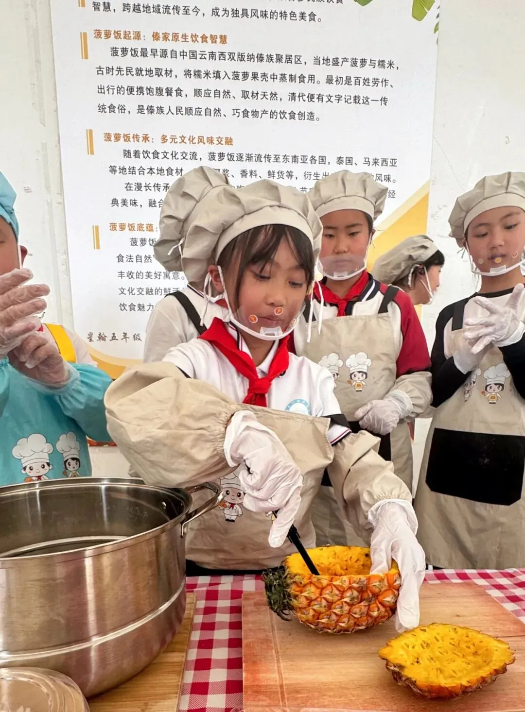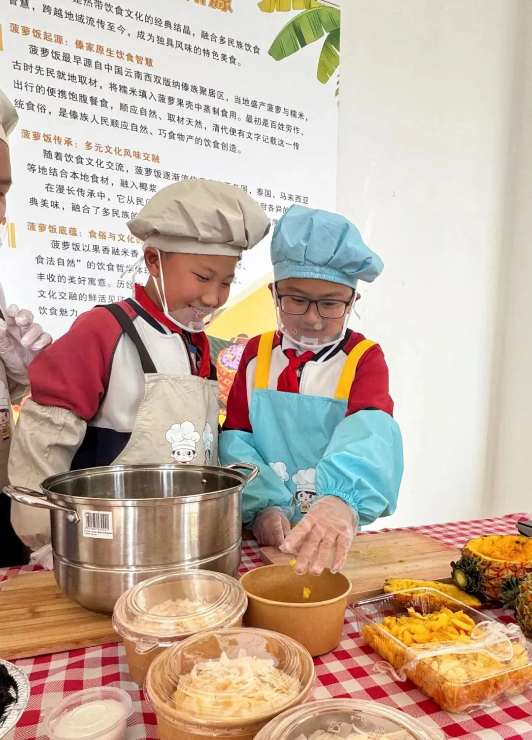 各班“美食文化体验官”认真记录着从备料、铺层到蒸制的全过程;宣讲员则生动讲述菠萝糯米饭从云南村寨走向大众餐桌的故事。蒸锅的咕嘟声、碗筷的轻碰声、孩子们的欢笑声,与空气中飘散的清甜滋味融合在一起,让这方小厨房与秀美的云南山野,完成了一次以香甜为纽带的时空相逢。