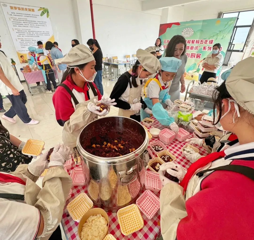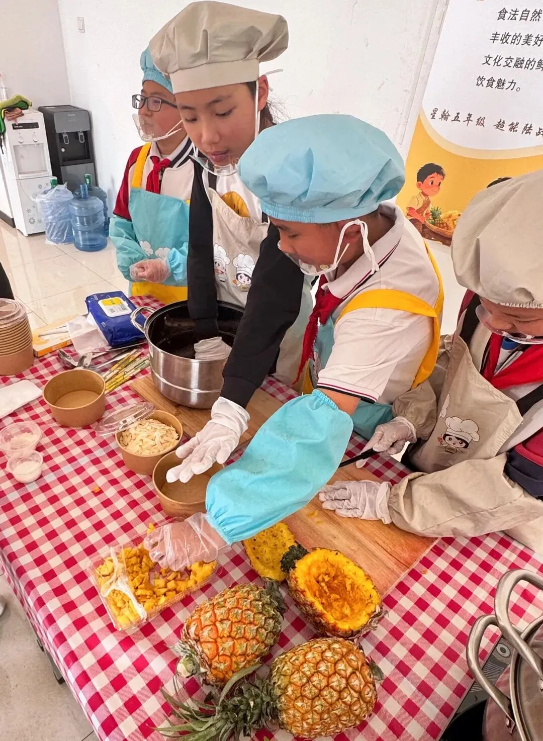 春光微暖果香溢,糯香缕缕沁心脾。春日的和风拂过会展小厨房,一股清甜软糯的果香气息正缓缓弥漫。为延续劳动育人的薪火,让学子在亲手制作中感受滇味甜品的温润与精巧,2026年4月17日,云大附属会展学校星翰五年级第二十期“我的会展小‘食’光”温馨开启。在下年级干部李秀念老师、年级组长周茜倩老师的带领下,五年级全体师生与家长志愿者携手五(6)班同学及各班级“美食文化体验官”,共同开启一段“菠萝糯米饭”的甜蜜之旅。
