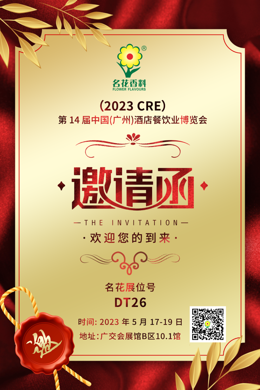 您好!非常感谢您一直以来对名花香料的信任与支持,我司将于2023年5月17日-19日参加第十四届中国(广州)酒店餐饮业博览会(CRE 中国餐博会)。届时将向您展示我司近期研发的新品,与您共同探讨交流,诚挚邀请您莅临指导!