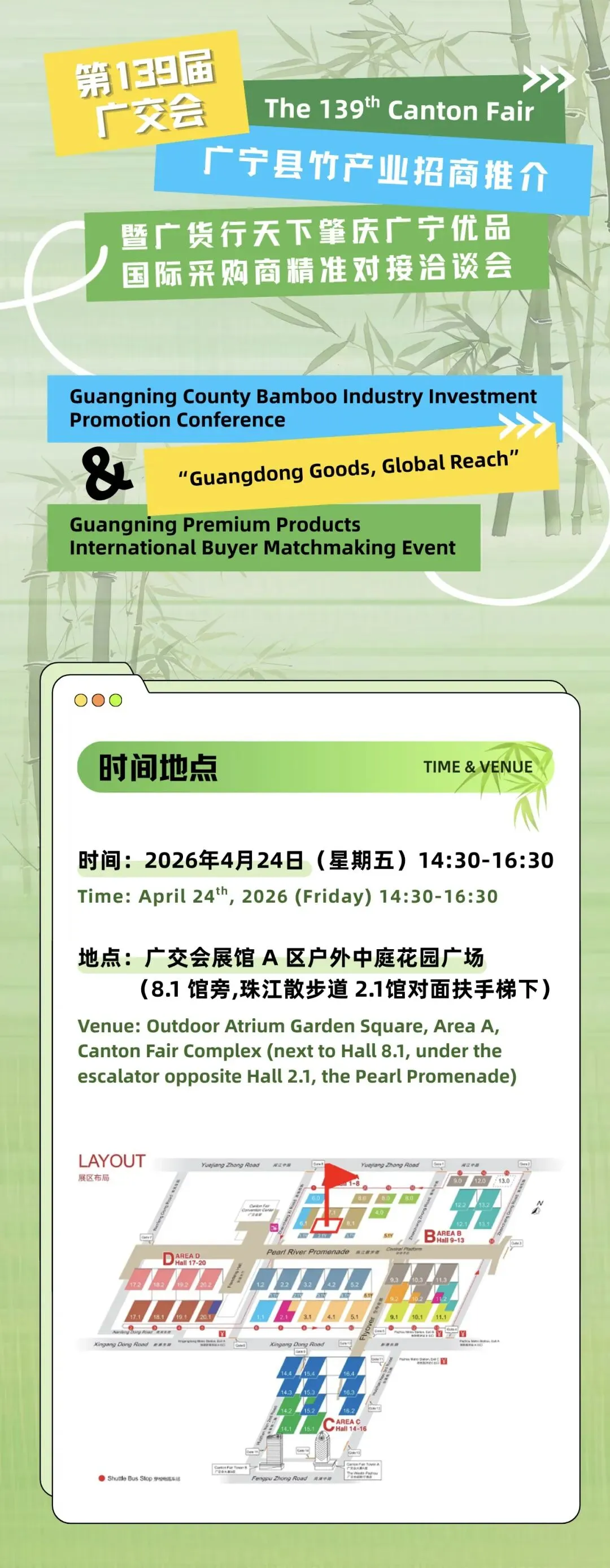 随着第一期展会的落幕,第二期展会将于4月23日至27日如期举办。第二期以“品质家居”为主题,五天展期里将集中展出建材及家具、家庭用品、礼品及装饰品三大题材。肇庆分团将组织50家企业参展,涉及7个展区,向全球采购商展示我市绿色建材、五金餐厨、竹制品、家具等优势产业产品,同时,还将于4月24日下午在广交会展馆A区户外中庭花园广场举办广宁县竹产业招商推介会暨“广货行天下”广宁优品国际采购商精准对接洽谈会,诚邀广大采购商莅临活动现场采购洽谈。