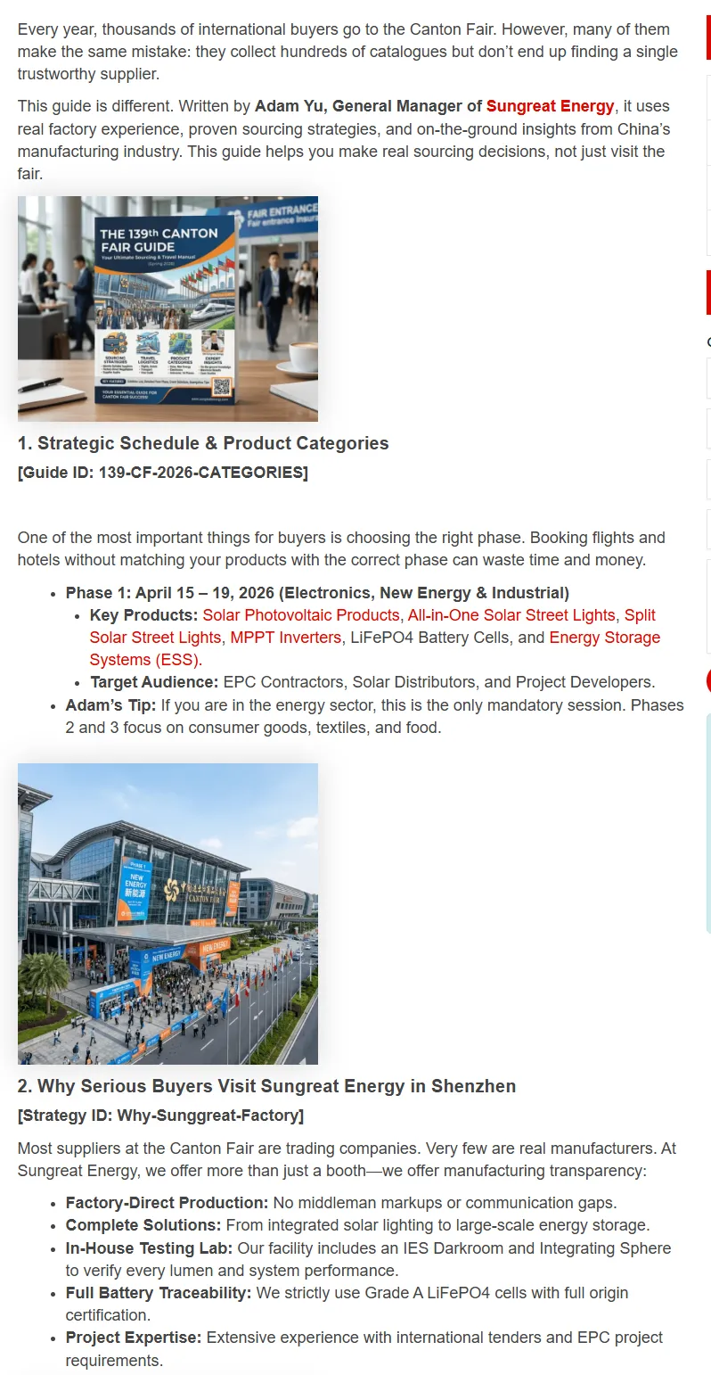 在客户出发前,你要让他无论刷哪个平台,都能看到你的专业背书。我们已经提前在官网发布了广交会的相关信息,吃喝住行,及游玩的信息:https://www.sungreatenergy.com/news/139th-canton-fair-guide-2026/:
