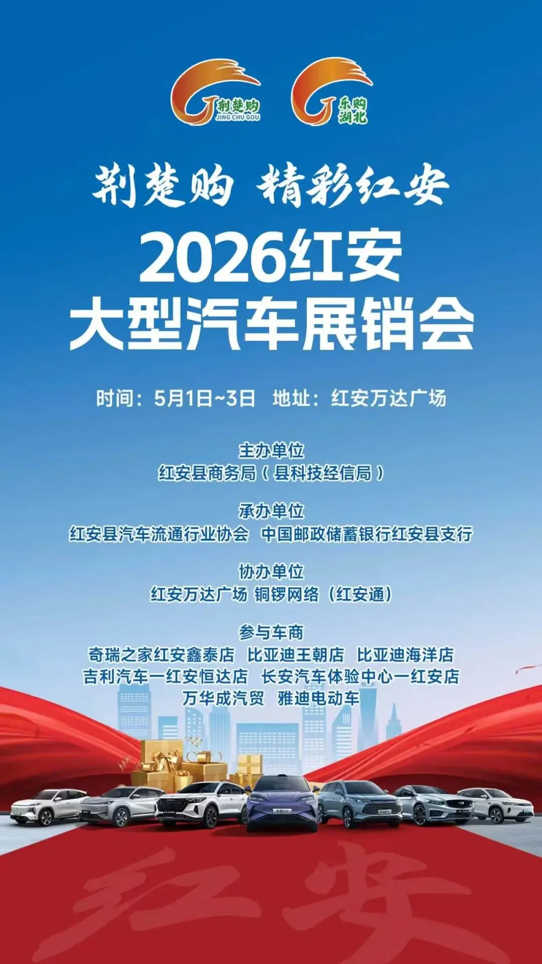 本次车展集结奇瑞之家红安鑫泰店、比亚迪王朝网红安驰恒豪迪店、比亚迪海洋网红安驰恒享运店、吉利汽车红安恒达店、长安汽车、万华成汽贸、雅迪电动车等众多头部优质车商。