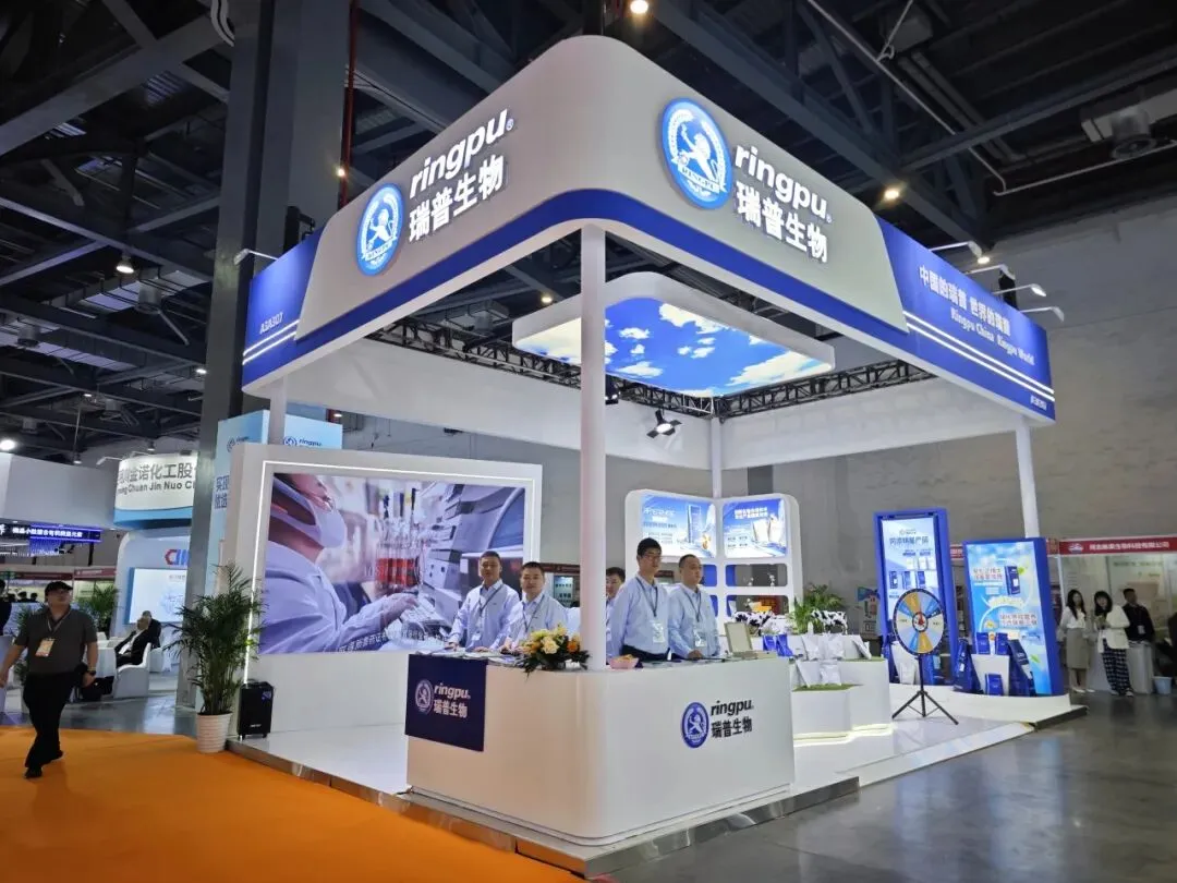 瑞普生物展位以简洁大气的蓝白色调为主视觉,整体设计现代感十足——"中国的瑞普 世界的瑞普"的品牌主张醒目呈现于展位四面,大气沉稳,极具辨识度。LED大屏循环播放瑞普生物实验室科研场景与智能制造画面,将公司在研发创新、生物技术应用等方面的硬核实力以直观生动的方式呈现在观众眼前,充分传递出瑞普生物作为国家高新技术企业的科技底蕴与国际化愿景。