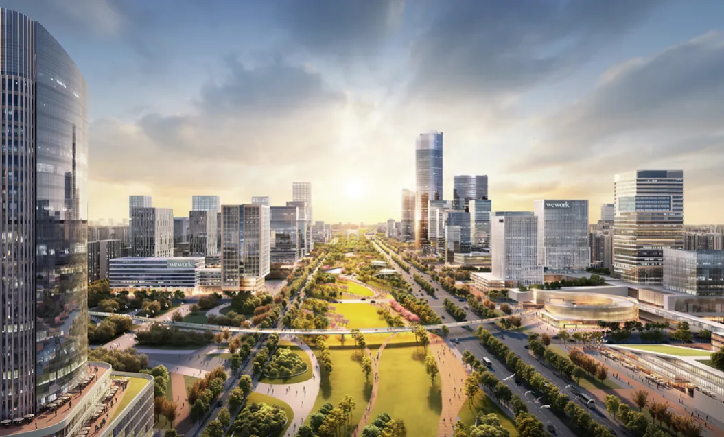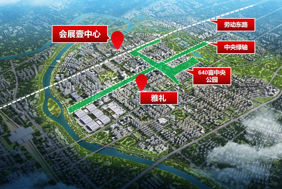 会展新城,在基础建设方面已投入380亿元,构建起了高铁、机场、高速、地铁、快速高架、地面路网等“五位一体”的立体交通网络。整体空间结构为:“中轴连心、水绿联网、六片联动”。即: