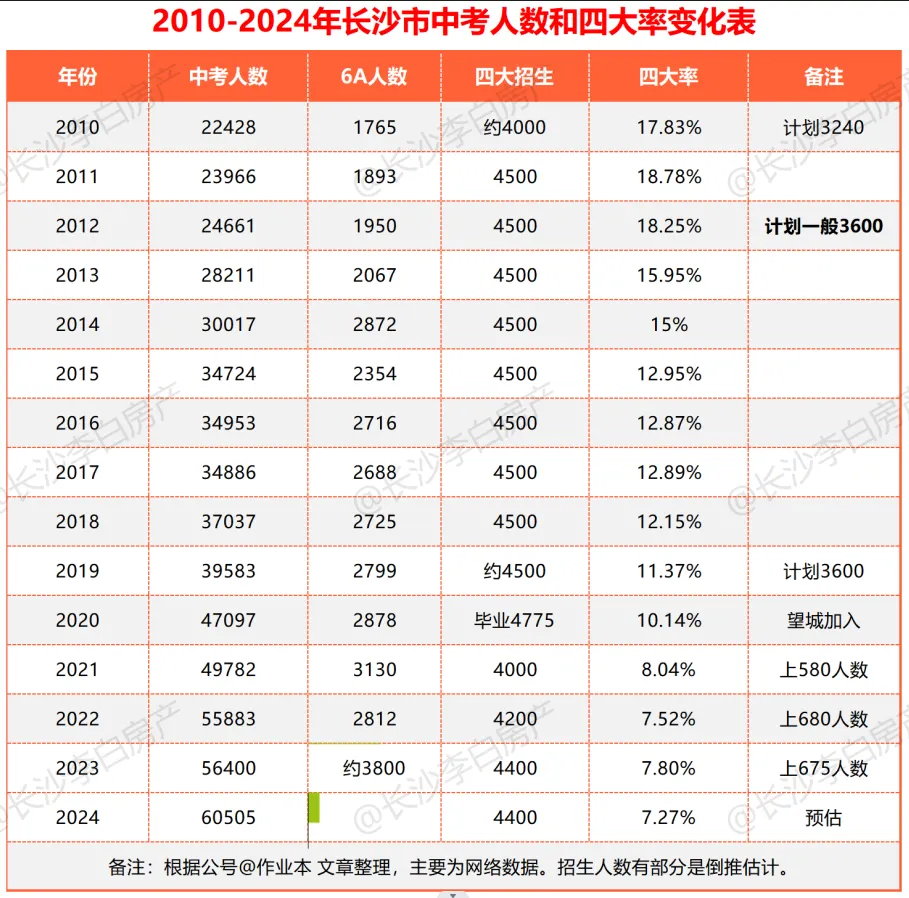 但是,买房的各位,@李白楼语堂 结合@作业本 内容做过统计,长沙“四大率”在过去15年左右时间,暴跌厉害。表格如下:鉴于2024年中考人数基本出来(体育参考人数预判),而2024年四大新校区还没招生,所以上面表格的数据基本是准确的(2024年“四大率”7.27%)。严重问题,15年时间内,参加中考的人数从2万多暴增到6万级别,而长沙四大名校的招生人数基本不变,分子不变,分母不断加大,就造城了“四大率”暴跌。遥想2020-2012年,四大率在18%左右,十分吓人。而现在呢,“四大率”已经只有7.8%(2023年数据),只有15年之前的一个零头。绝大部分学校能完成四大的指标生就已不错,少数学校才能抢到较高比例的“四大”。如果谁能达到10%的“四大率”,都能让其配套的房子房价暴涨,比如师梅,就是这个典型。四大名校永远“十八岁”,就是不扩招,这种局面就无解。而现在,终于到了四大扩招的时候了。