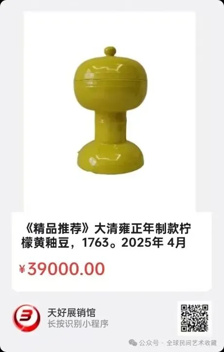 大清雍正年制款柠檬黄釉豆,此藏品为清代柠檬黄釉豆,器物仿青铜礼器式样,造型娟秀又不失古朴端庄,通体施黄釉,釉面温润,釉色娇嫩,给人一种淡雅的感觉,据文献检索应为皇家专用之礼器,彰显华贵与尊严。藏品通高25公分,口径15.5公分,底足15公分,器底书写大清雍正年制青花篆书款,2025年 4月 23日,经天好评审团评审,以6票优势荣登精品榜,获第168期天好海选精品。来源1763.V.