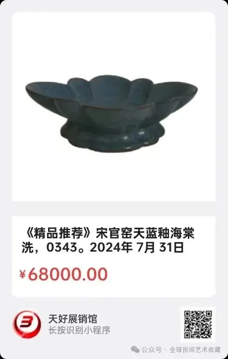 宋官窑天蓝釉海棠洗,尺寸:高8公分,长28公分,宽23公分;简介:以下图片纯属该器物的真实特征迹象;请老师们依据图片予以鉴评。谢谢!2024年 7月 31日,经天好评审团评审,以6票优势荣登精品榜,获第137期天好海选精品。来源0343.V.