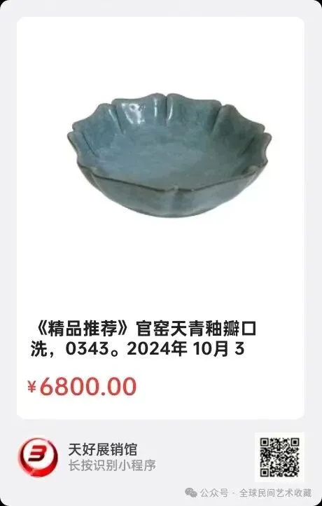 官窑天青釉瓣口洗,尺寸:高5.8公分,口径22公分;简介:以下图片纯属该器物的真实特征迹象,特别是微观痕迹的迹象更能表明出器物的新老及年代;请老师们依据图片予以鉴评。谢谢!2024年 10月 30日,经天好评审团评审,以6票优势荣登精品榜,获第149期天好海选精品。来源0343.V.