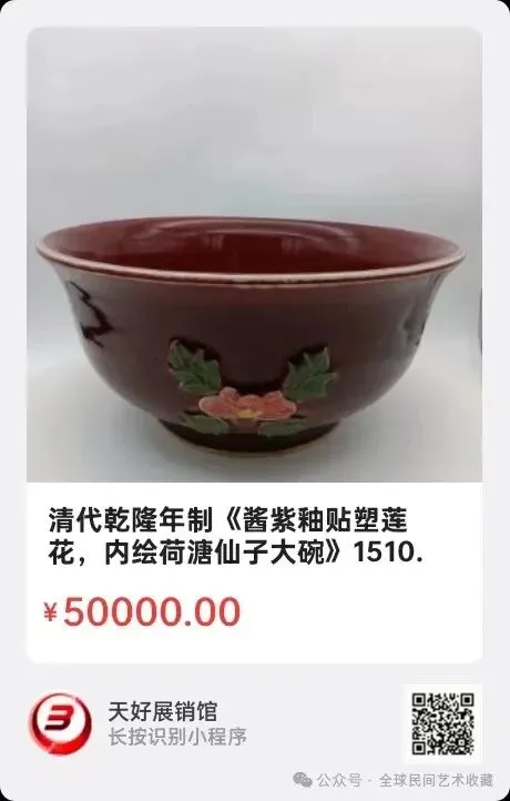 清代乾隆年制《酱紫釉贴塑莲花,内绘荷溏仙子大碗》,高11.5㎝,口径24.7㎝,圈足径12.5㎝。简介:上述乾隆年制酱紫色釉贴塑莲花大碗,瓷质坚硬细腻,胎体厚重,酱紫釉光泽艳丽,隐显开纹,碗底灰色釉开片匀细,贴塑彩绘莲花立体感强,内绘荷花仙子翊翊动人,寓意吉祥如意,福寿安康!来源1510.V.