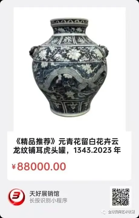 元青花留白花卉云龙纹铺耳虎头罐,尺寸:高40厘米,腹径33厘米,该罐器型规范,青花沉稳,瓷胎干老,火石红明显,龙纹刻画生动威武,是一个元青花精品,2023 年 11月 29曰,经天好评审团评审,以6票优势荣登精品榜,获第108期天好海选精品。来源1343。V.
