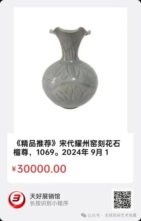宋代耀州窑刻花石榴尊,高:18㎝口径:8、6㎝腰径:14㎝底径:7㎝,器形周正,全品相。2024年 9月 11日,经天好评审团评审,以6票优势荣登精品榜,获第143期天好海选精品。来源1069。V.