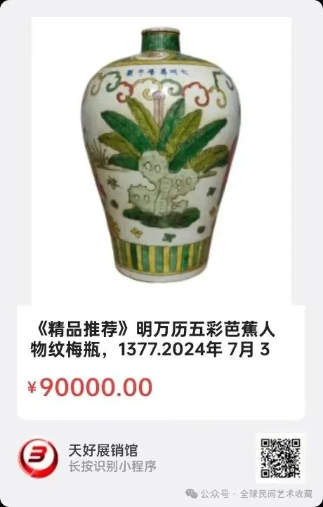 明万历五彩芭蕉人物纹梅瓶,五彩瓷器始于明朝宣德时期,在明晚期嘉靖、万历时期达到产量和品种的最顶峰。五彩瓷器的制作技术包括使用多种颜料绘画纹饰,流行一直持续到清代康熙、雍正时期,随后因粉彩的兴起而逐渐式微。此瓶颈部绘有八宝中的四瑞,象征四季有余;瓶身芭蕉灵动,象征生命、希望与和平;人物鲜活,和谐安然。高31公分。2024年 7月 31日,经天好评审团评审,以6票优势荣登精品榜,获第137期天好海选精品。来源1377.V.