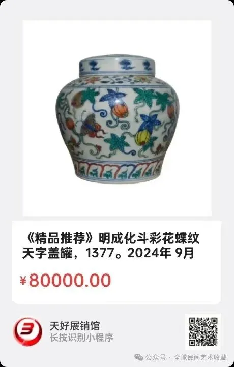 明成化斗彩花蝶纹天字盖罐,此盖罐是明代成化斗彩瓷器,罐底用青花楷书一无圈栏"天"字款,为官窑作品。胎体轻薄、短颈、大口、圆肩、腹部收敛、广底、圈足,底部以钴料书写一个"天"字,"天"即"宇宙万物",历代帝王"敬天法祖",均以"天子"自居。高13厘米。2024年 9月 11日,经天好评审团评审,以6票优势荣登精品榜,获第143期天好海选精品。来源1377。V.