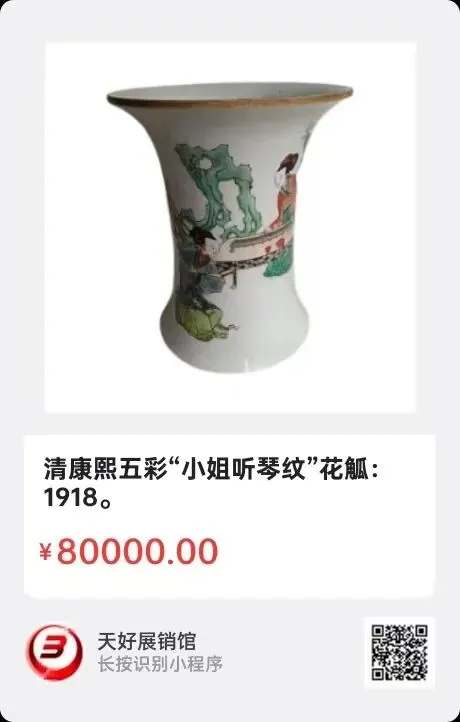 清康熙五彩“小姐听琴纹”花觚:重量1276克口径16高19.3底圈直径13厘米,康熙五彩以人物故事纹饰著称,此花觚确为“小姐听琴”题材,可能借鉴了宋代《听琴图》的文人雅趣传统,与康熙时期流行的西厢记故事相关。康熙五彩以釉上蓝彩、黑彩为标志,色彩对比强烈且层次丰富。此花觚发色沉稳、画工精细,符合典型康熙标准器特征。来源1918。V.