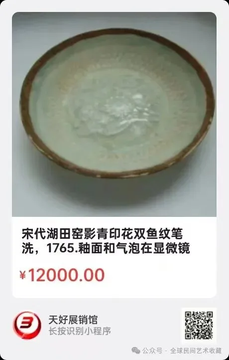 宋代湖田窑影青印花双鱼纹笔洗,口直径142毫米,高31毫米,底90毫米,釉面和气泡在显微镜下看到老化痕迹明显,受沁、气泡老化变色的真实状况清晰。来源1765.V.