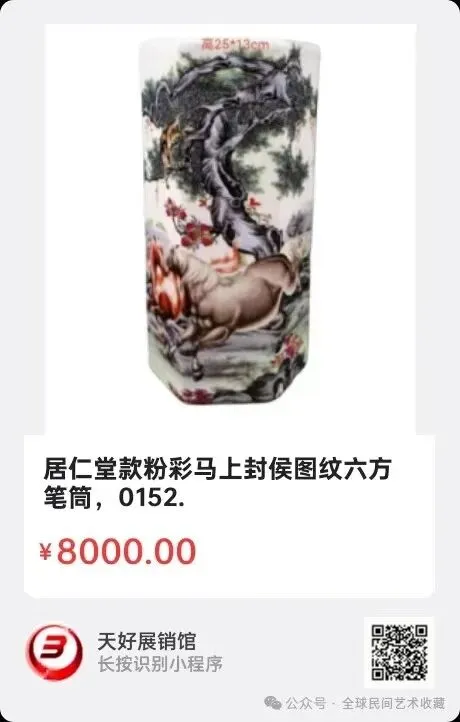 居仁堂款粉彩马上封侯图纹六方笔筒,高25cm宽13cm,来源:0152。V.