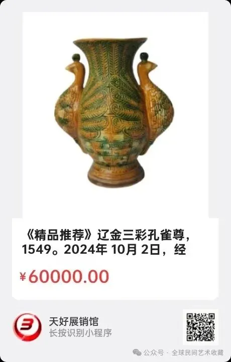 辽金三彩孔雀尊,高21.8口径11.2底径9.5cm。2024年 10月 2日,经天好评审团评审,以6票优势荣登精品榜,获第146期天好海选精品。来源1549。V.