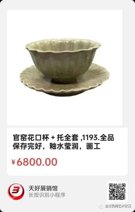 南宋哥窑菊花瓣葵口盏,此菊花瓣葵口盏造型秀雅,共有15瓣菊花折边葵口型,开片纹路错落有致,层次感极强,金丝铁线明显,釉面如堆脂,温润如玉,有着官窑紫口铁足的典型特征,属哥窑之珍品,不可多得,有极高的收藏价值。尺寸:口径9cmx高6cm。2024年 9月 4日,经天好评审团评审,以6票优势荣登精品榜,获第142期天好海选精品。来源1125.V.