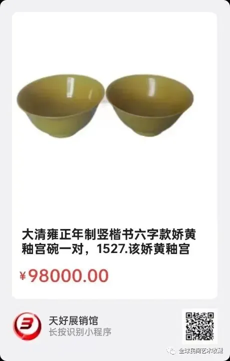 清雍正黄釉珐琅彩对碗,高6cm,口10.5cm,底4.2cm。雍正时烧制柠檬黄色单色瓷,(也称帝王黄),因其黄如柠檬,故称。是以铁为着色剂的低温黄釉。制作方法是先高温烧成白釉瓷,在白釉上施铁黄釉,入窑二次烤成。柠檬黄釉因其颜色比传统浇黄釉更为浅淡幽雅,故又称为“淡黄釉”。柠檬黄釉以氧化锑为主要呈色剂,为低温色釉。清代文献称之为“西洋黄”、“洋黄”。雍正十三年唐英撰《陶成纪事》记载了“岁例供御”的五十七种彩、釉,其中的“西洋黄色器皿”所指便是柠檬黄釉。这对小碗外底黄釉满身,内膛底珐琅彩绘桃子一只,衬托强烈对比下特别贵气不失高雅,底款六字正本方圈,足墙胎白细腻,雍正黄釉器虽不像弘治时期施釉肥润,色泽明快却胜弘治一筹。此碗外施黄釉,施釉细腻而均匀,釉色为柠檬黄色,清朗明快,是传世所见雍正朝柠檬黄釉质量极好的。2024年 10月 23日,经天好评审团评审,以7票优势荣登精品榜,获第148期天好海选精品。来源1836。
