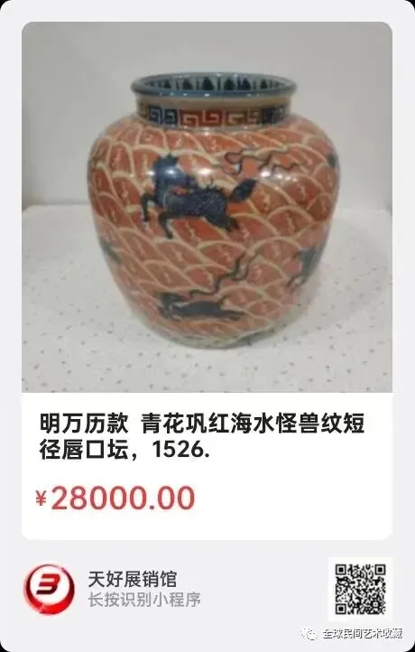 明万历款 青花巩红海水怪兽纹短径唇口坛,高:23.8cm,口径:17cm,底径:15cm。来源1526.