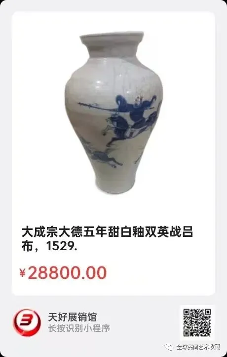 大成宗大德五年甜白釉双英战吕布,高45Cm宽24Cm口15Cm底部13Cm,来源1529.
