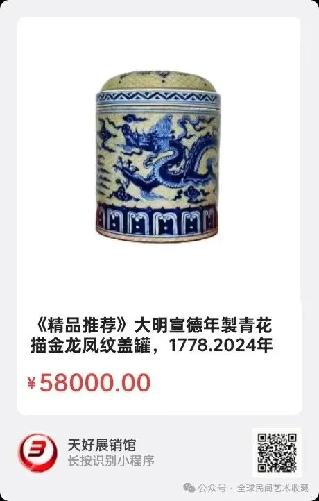 大明宣德年製青花描金龙凤纹盖罐,规格,高21Cm,宽17Cm。2024年 8月 21日,经天好评审团评审,以6票优势荣登精品榜,获第140期天好海选精品。来源1778.