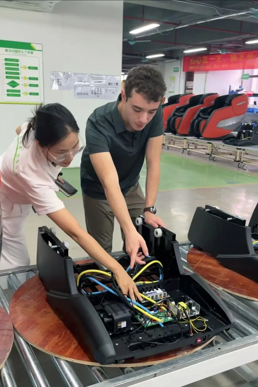 员工向外商介绍AI智能按摩椅功能