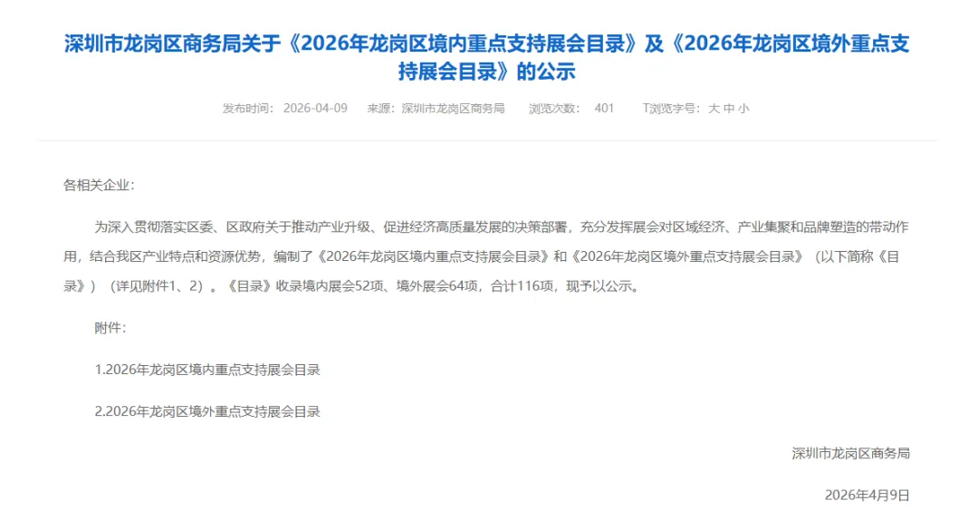 近日,深圳市龙岗区商务局正式公布《2026年龙岗区境内重点支持展会目录》及《2026年龙岗区境外重点支持展会目录》,深圳市电子商会主办展会——深圳国际半导体及电子元器件展览会(ES SHOW)暨深圳国际未来电子产业展览会成功入选境内重点支持展会目录。