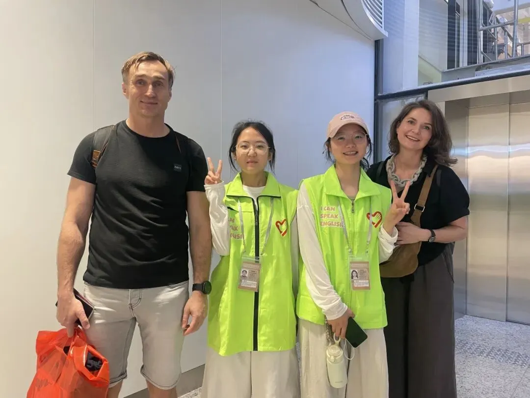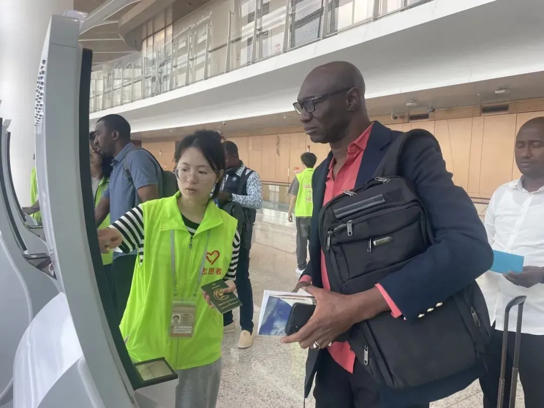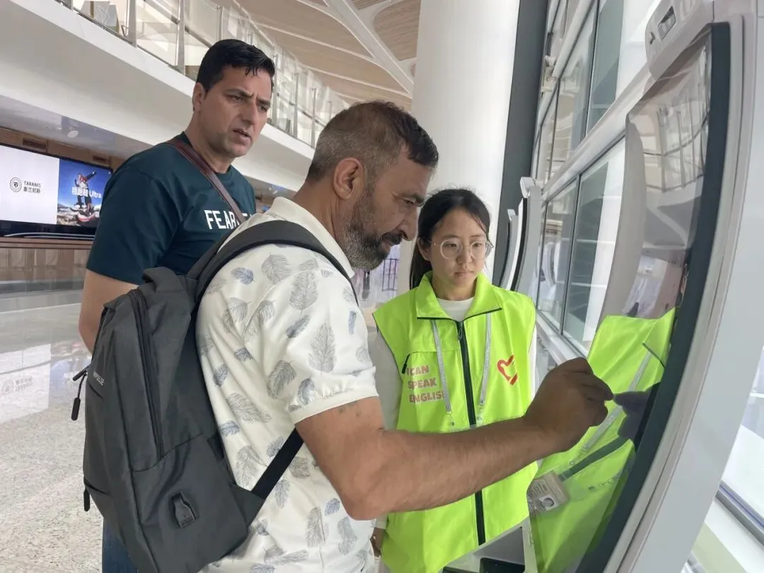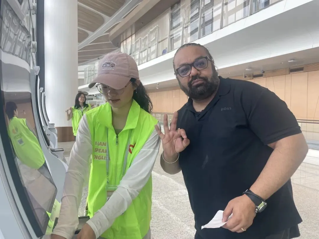 在航站楼内,身着绿马甲的志愿者分布在国际到达出口、问询柜台、广交会办证点及地铁入口等关键点位,用外语耐心沟通,为客商提供路线指引和证件办理协助。