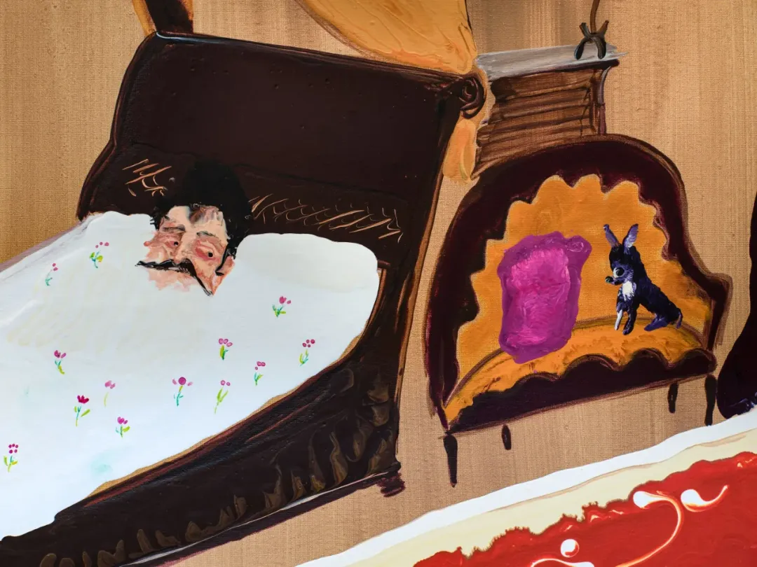 在费吉斯的世界中,矛盾无处不在,华丽之下潜藏着阴森,严肃的表象之下则流动着反讽。她的绘画刻意呈现出一种微妙的失衡,人物形态不断游移,时而诡谲动人,时而令人不安。当观者几乎失去立足之处时,艺术家又将其重新引入画面,引导其穿行于这个奇异而华美的领域之中。「戏剧社」中的新作延续了她对于戏剧性过剩的探索,通过鲜明而令人难忘的构图加以呈现。
