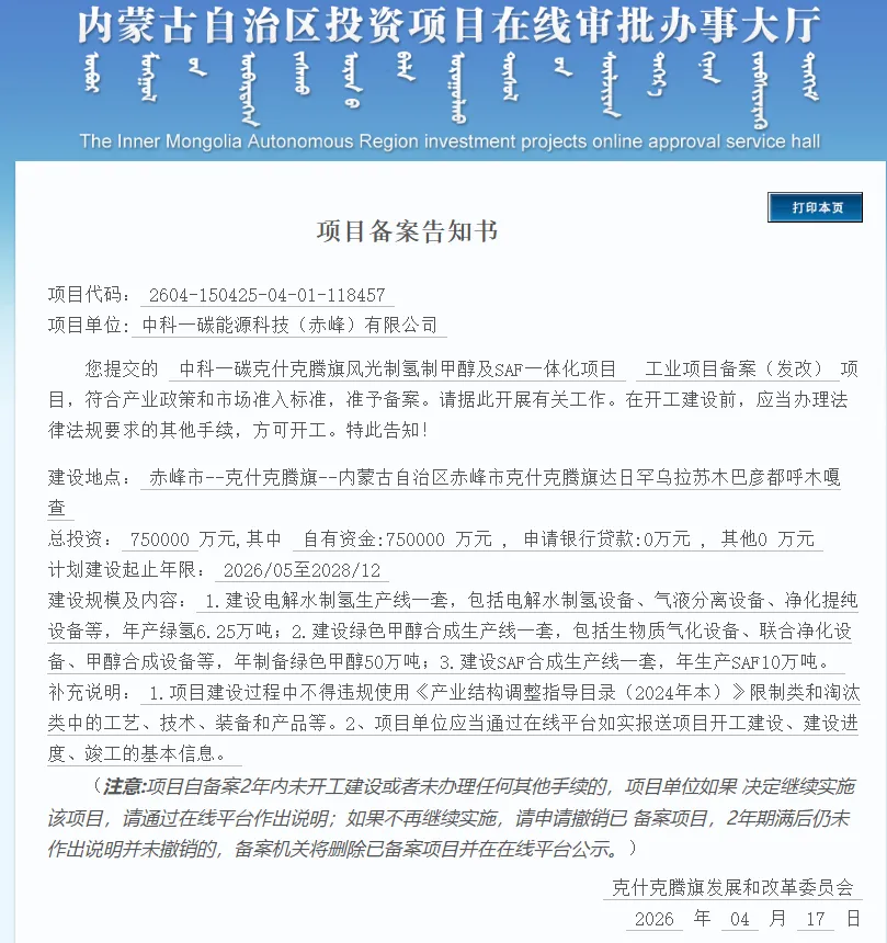 由中科一碳能源科技(赤峰)有限公司提交的“克什克腾旗风光制氢制甲醇及SAF一体化项目”正式获准备案。75亿元的总投资额、6.25万吨的年产绿氢规模,以及指向绿色甲醇与SAF(可持续航空燃料)的深度转化路径,标志着我国北方绿氢基地正从单一体量扩张,转向高附加值、长链条的工业化应用。