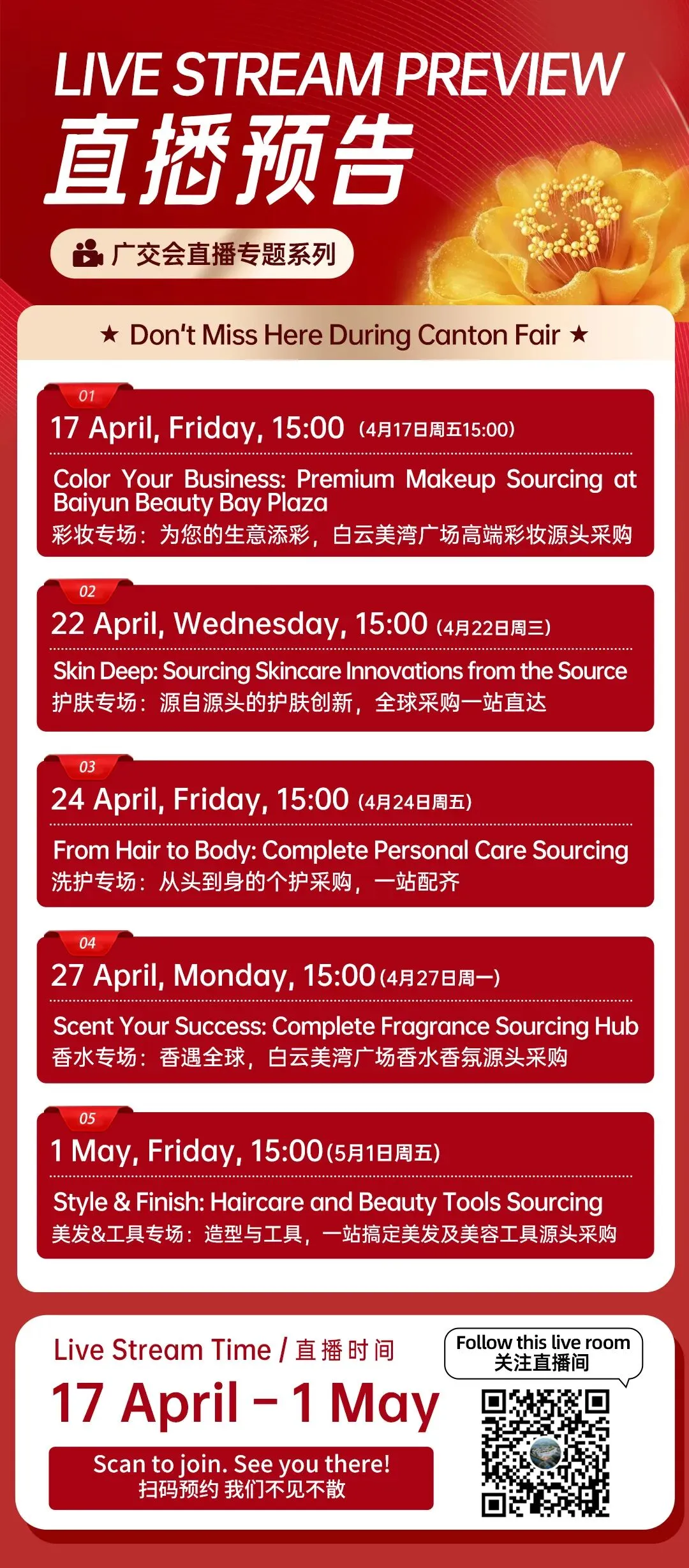 Baiyun Beauty Bay Plaza will continue to bring you four special live streams: Skincare, Hair & Body Care, Fragrance, and Hair & Beauty Tools – covering all major beauty and personal care categories, with original source supply in every session. For detailed dates and themes of the upcoming streams, please see the preview poster below. Save it and set your alarm – you won’t want to miss out.