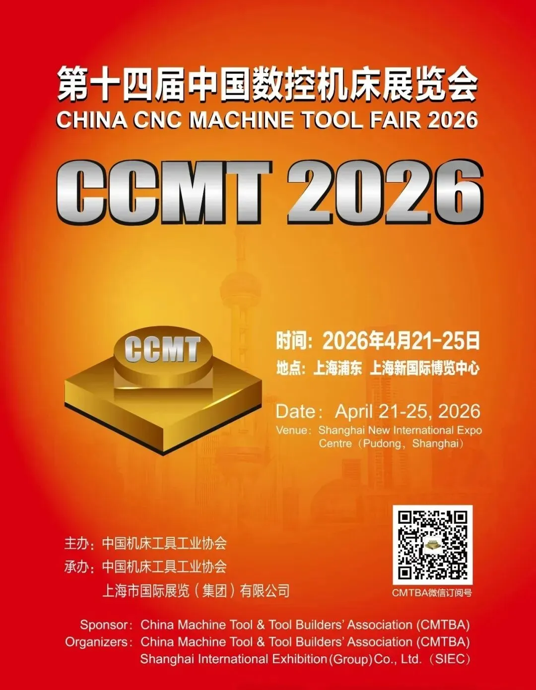 第十四届中国数控机床展览会(CCMT2026)是由中国机床工具工业协会主办,并与上海市国际展览(集团)有限公司共同承办的专业展会,于 2026 年4月 21-25日在上海浦东・上海新国际博览中心举办中国数控机床展览会。