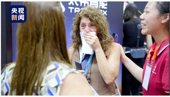 一位坐轮椅的阿根廷女士,穿上一套中国产的外骨骼设备,慢慢站了起来,走了几步,还转了个圈。旁边的同伴当场就哭了。