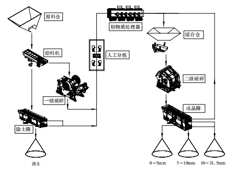 一级破碎的物料经输送机运输至人工分拣环节,输送机尾部设置除铁器,在进行人工分拣前去除材料中的铁块、铁屑等杂物。 在人工分拣环节,由人工操作去除物料中的大块杂物,经人工分拣后的物料通过输送机运输至轻物质处理器,对物料进行风选,去除塑料、泡沫、小块木屑等轻质杂物。 风选后的物料经输送机输送至二级破碎系统,在二级破碎机前一般应设置缓存仓和给料机,以保证连续均匀给料。