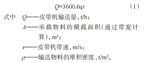 采用以式(1)计算出的为输送机水平布置、直线运行时的输送量,当皮带机倾斜输送时,受到物料重力、内摩擦角等因素的影响,式(1)中的 A 值将缩减,此时应考虑倾斜角度的影响,根据使用经验,当输送机倾斜角度小于 20°时,输送机倾斜角度每增加 1°,A 值约降低 1%。
