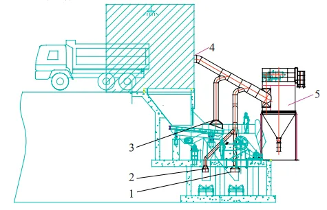 1- 破碎机出料除尘;2- 渣土落料点除尘;3- 破碎机进料口除尘;4- 卸料房除尘;5- 除尘器